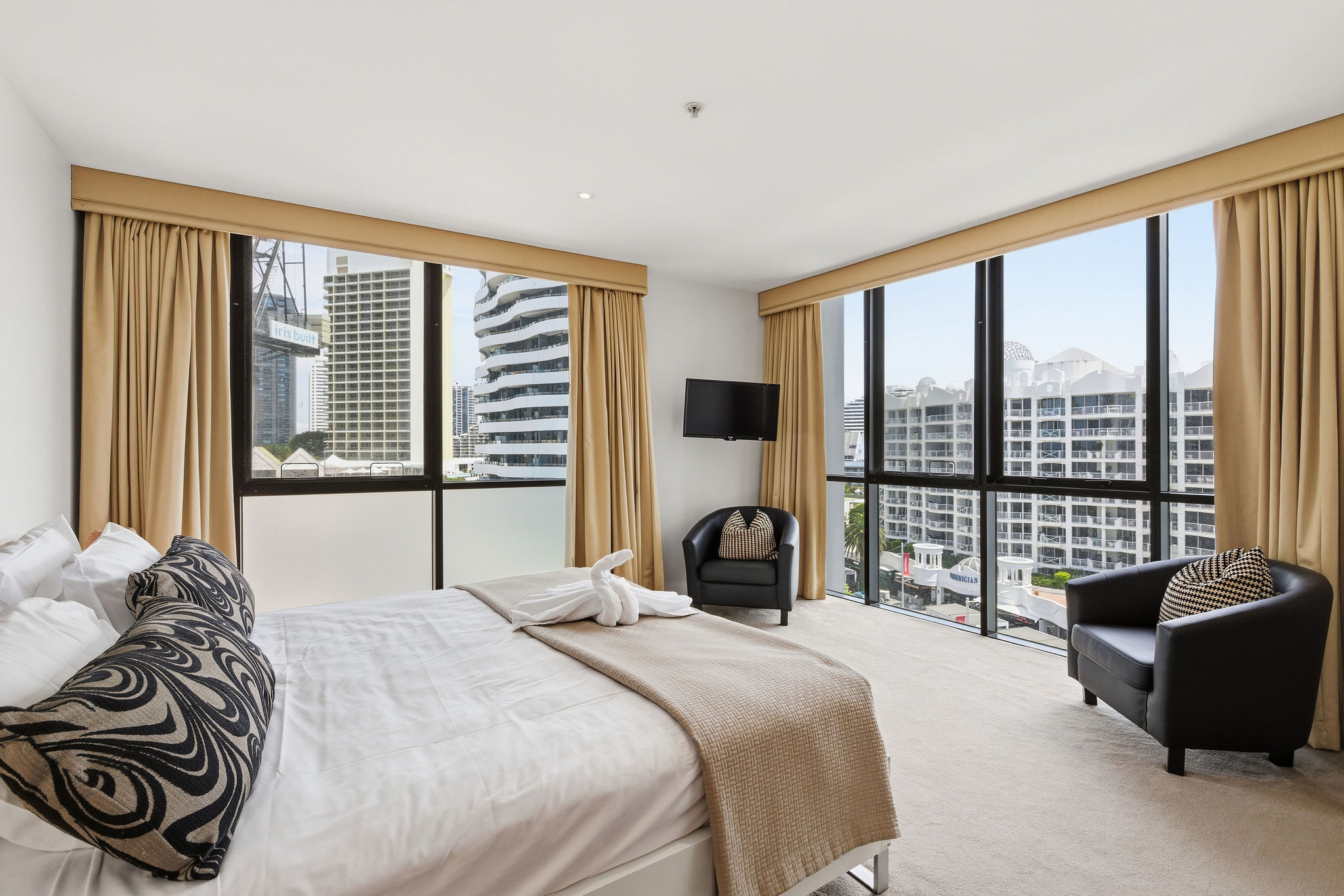 Our 3 bedroom apartments sleep 6 and feature 1 King, 1 Queen and 2 single size beds (other bedding available on request). It also has ensuite bathrooms, spa baths and walk-in wardrobes. The 3 bedroom apartments also feature an impressive entertainment area with a large LCD / Plasma TV with Digital Foxtel perfect after a long day touring the city.